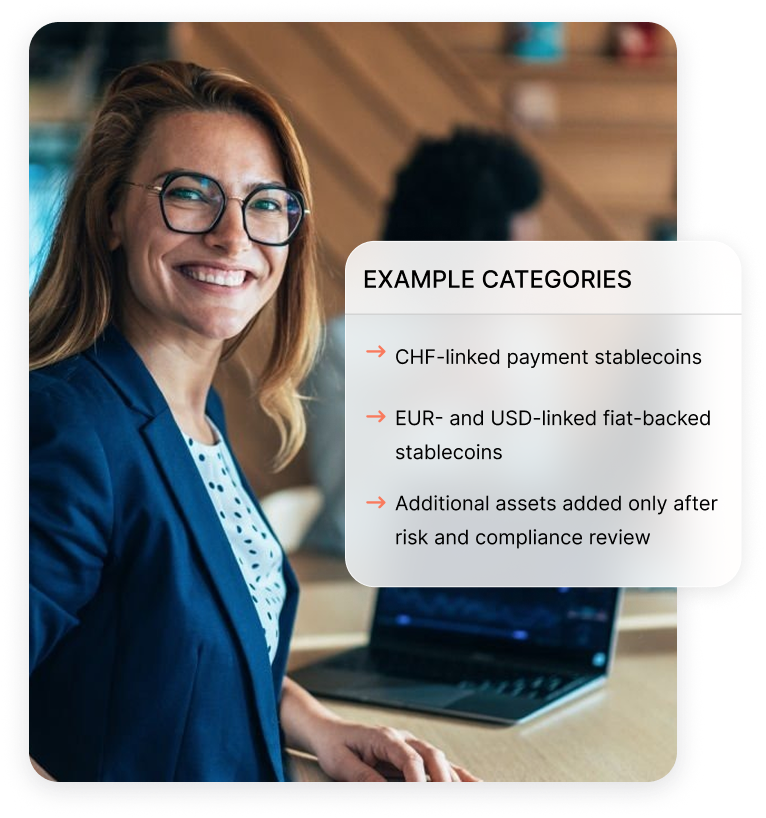 We focus on selected fiat-backed stablecoins issued by recognised issuers and designed primarily for payments and treasury. Specific supported assets may change over time based on risk and regulatory criteria.